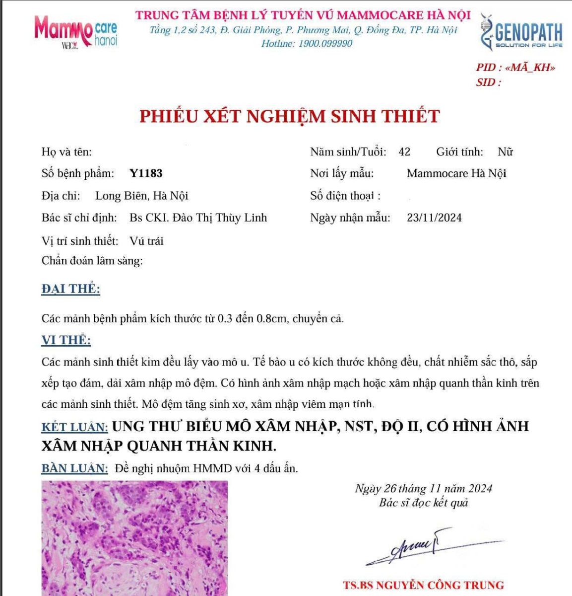 Người thứ ba, 42 tuổi, kết quả còn đáng lo hơn khi bác sĩ mô bệnh học ghi rõ: "Ung thư biểu mô xâm nhập, có hình ảnh xâm nhập quanh thần kinh." Điều này có nghĩa là tế bào ung thư đã có dấu hiệu lan ra ngoài mô vú, và quá trình điều trị sẽ phức tạp hơn.